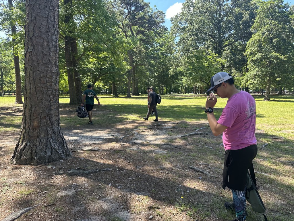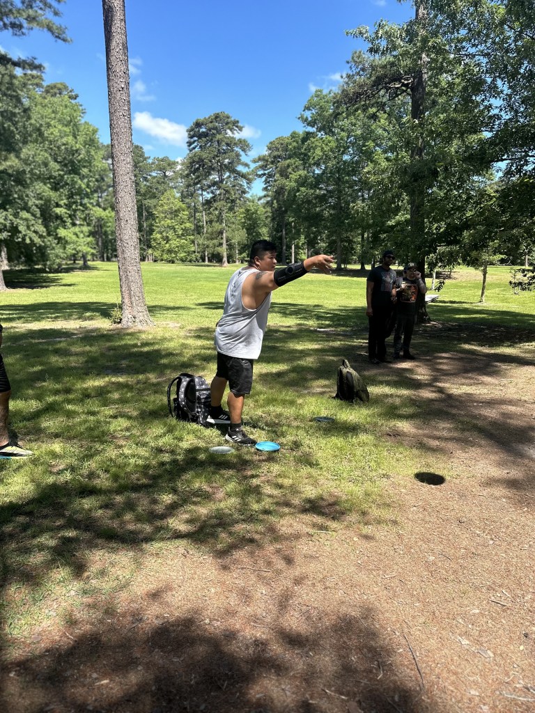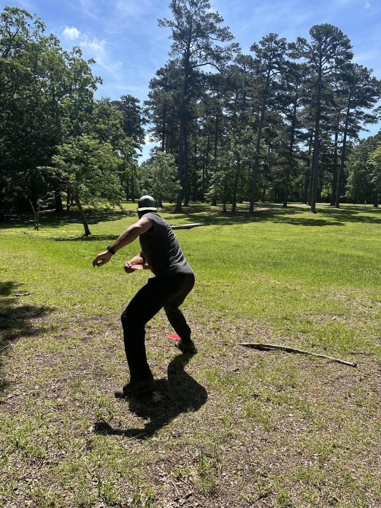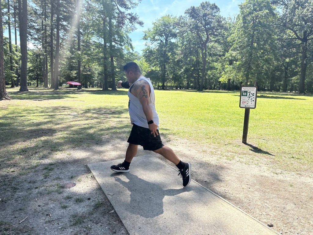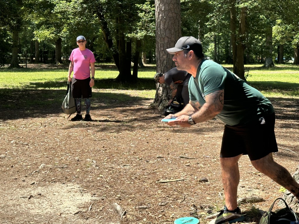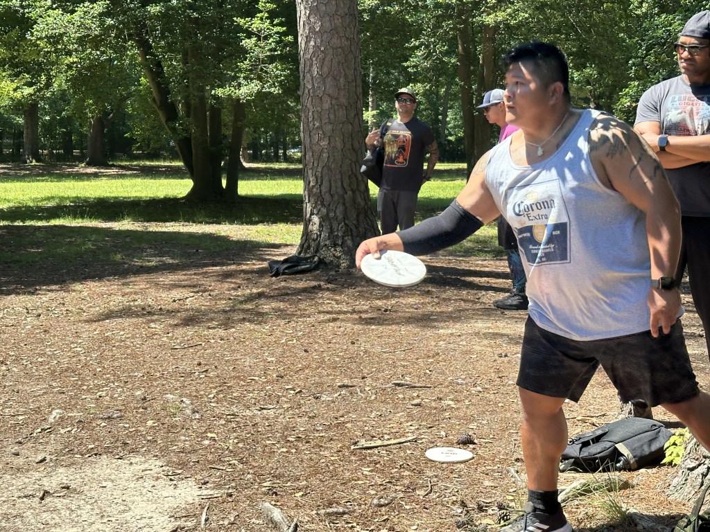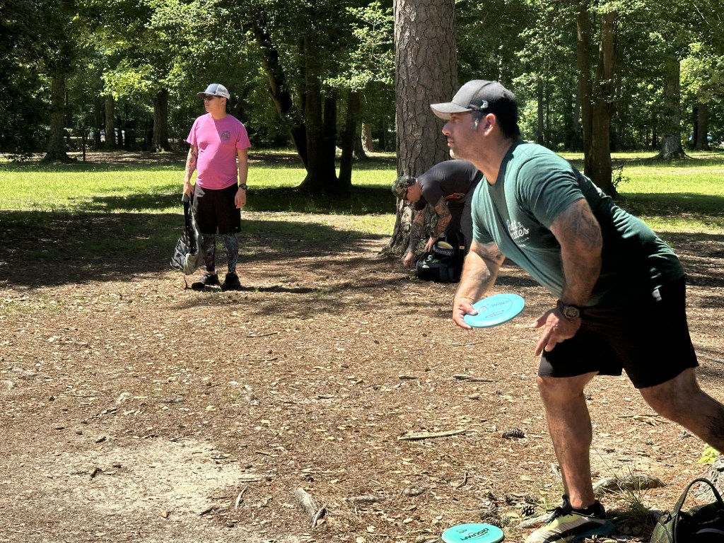 We set sail off the first tee, and it was clear the crew had rested their sea legs and arms, for the initial throws were rock solid. In truth, everyone played exceptionally well throughout the day. Master-at-Arms Ernest Huizar triumphed in the CTP on hole 10, with his disc landin’ a mere 10.7 meters from the tee, bestin’ your captain by a single meter. The cunning dog!
