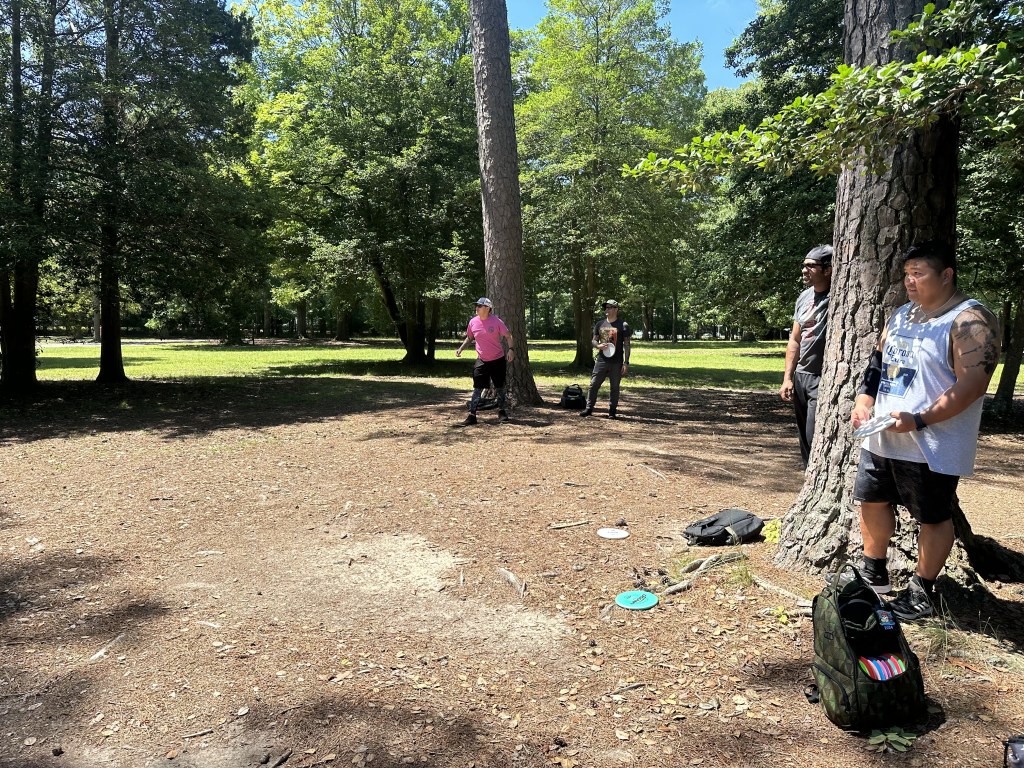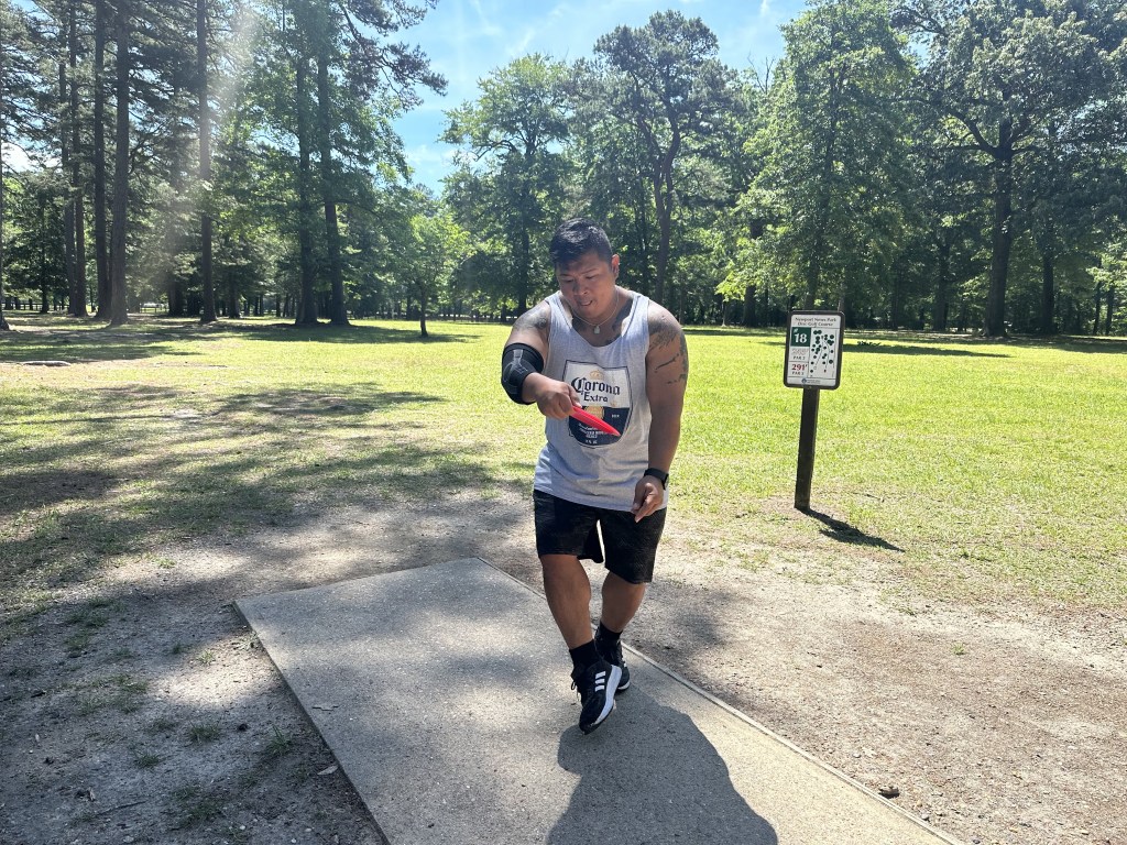 Upon arrival, I found Quartermaster Jasper Gutierrez and Cook Mike Mui engaging in a bit of skulduggery, practicing on hole 10 for the CTP later in the round. Cheatin’ scallywags! Once the full crew assembled, we did the ol’ “flip disc” for random doubles. The teams were set: Quartermaster Jasper Gutierrez and Master-at-Arms Ernest Huizar, Boatswain Stefanie Bonsky and Gunner Shelly Jackson, and meself, Captain Patrick McCormick, paired with Cook Mike Mui.