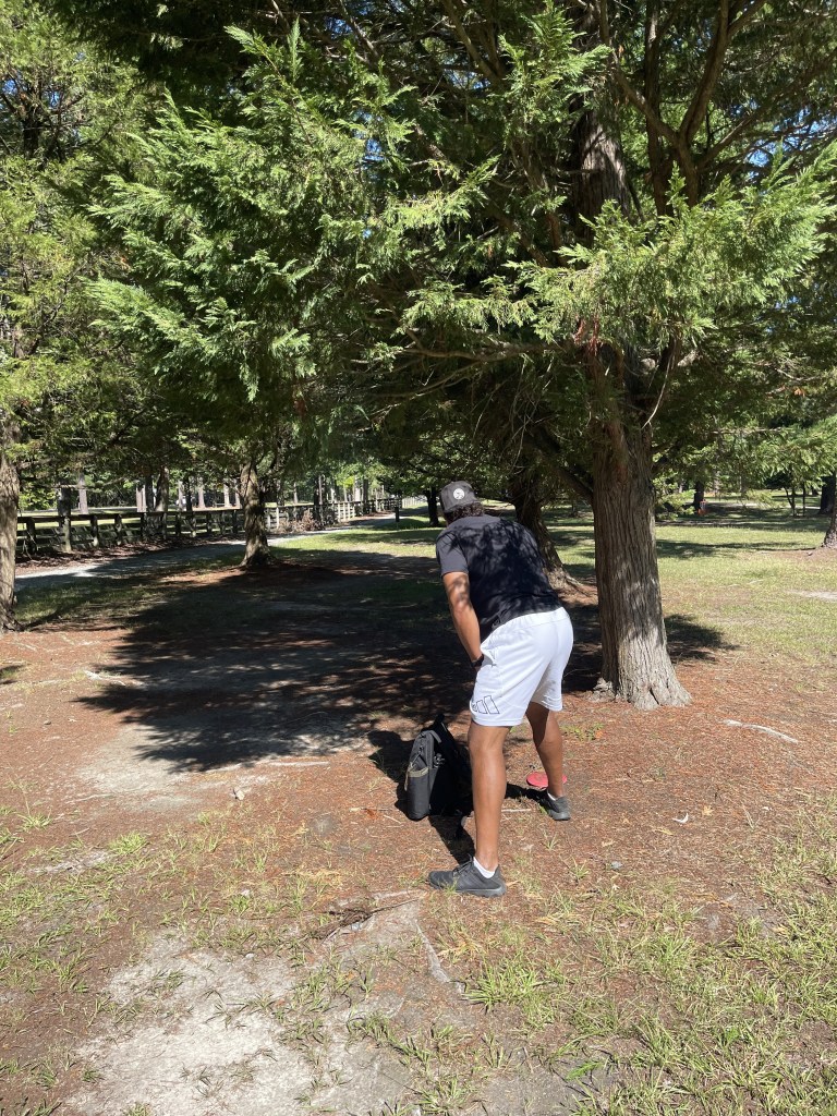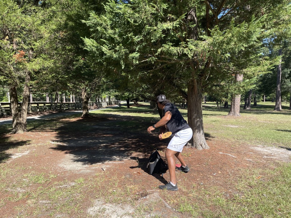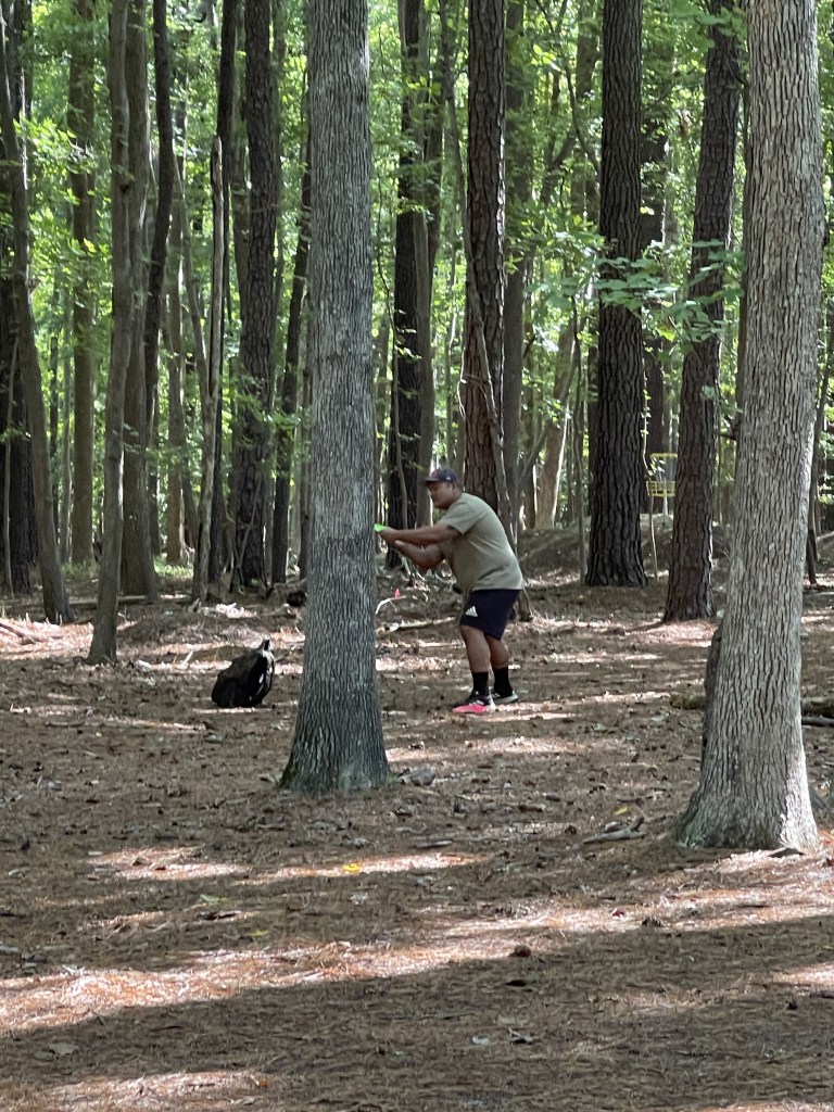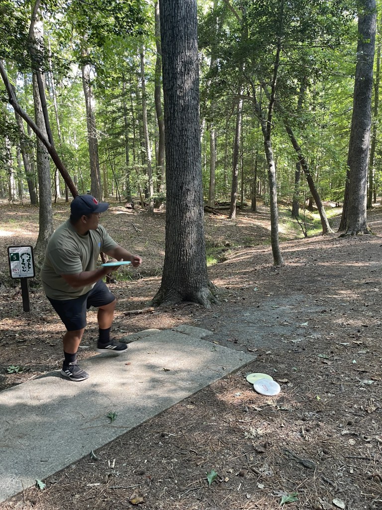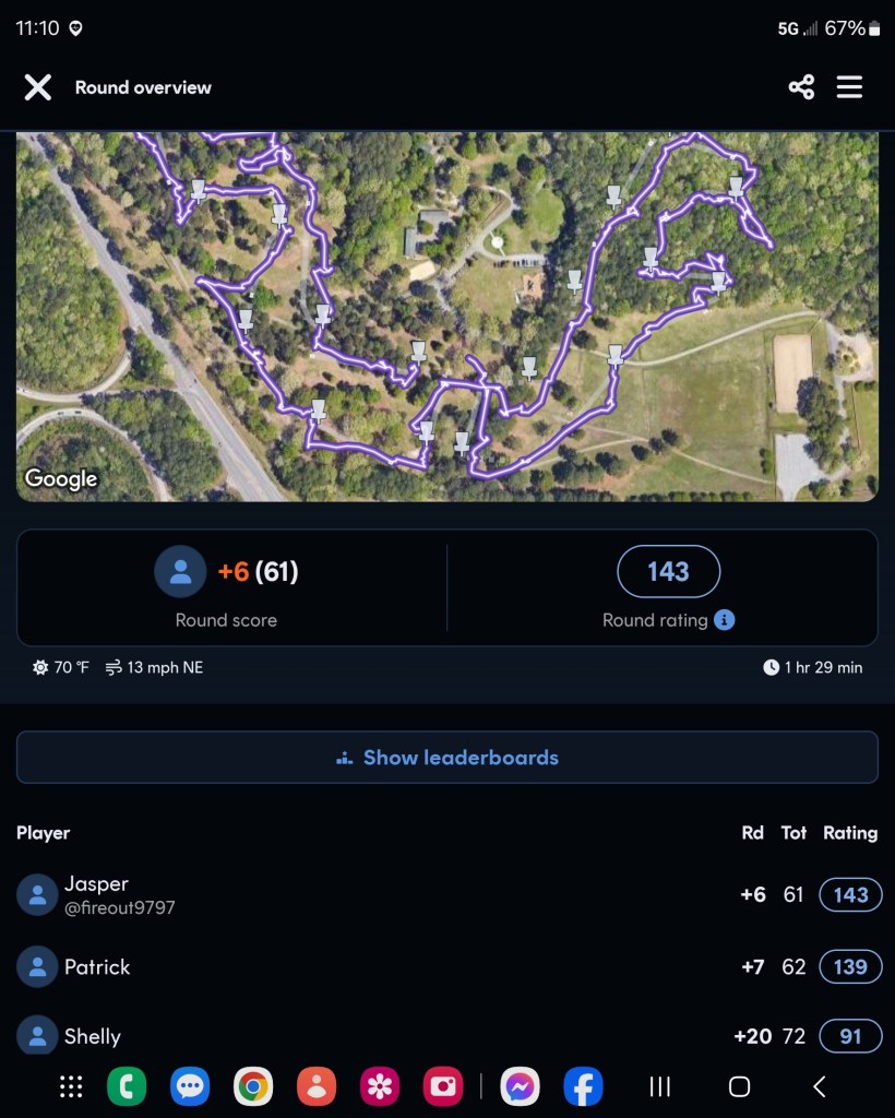 Ahoy, me hearties! The skies were clear, the weather fair, and the winds calm as we set sail on the Newport News Park course. A fine crew we had today: Quartermaster Jasper, Gunner Shelly, Boatswain Stef, and meself, Ship Captain Patrick. The day promised a battle o’ skill, but we chose not to draw from the RIPT deck. Instead, we sailed a more peaceful route—singles play, short to longs, takin’ on the new basket placements where available.