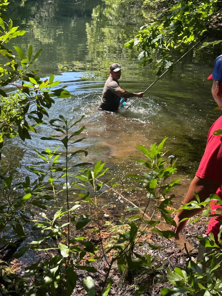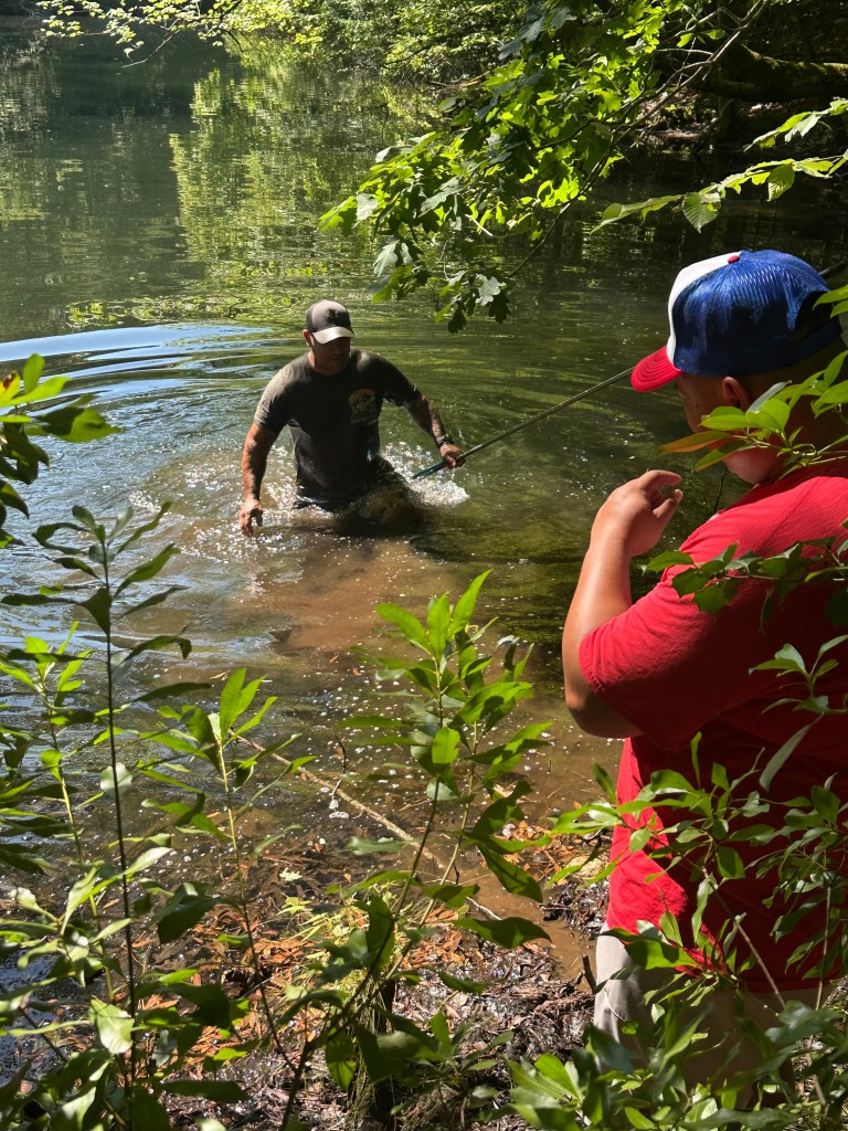 Back at Waller Mill, Jasper and Lou were already teein’ off on hole 1, lookin’ sharp and ready to plunder a victory. Jasper brought a caddy wearin’ a fan hat—a curious lad more interested in frogs and flowers than discs and distances. At one point, he waved a frog at Jasper, who let out a shriek so loud it startled birds and bolted straight into the woods like he’d seen Davy Jones himself.